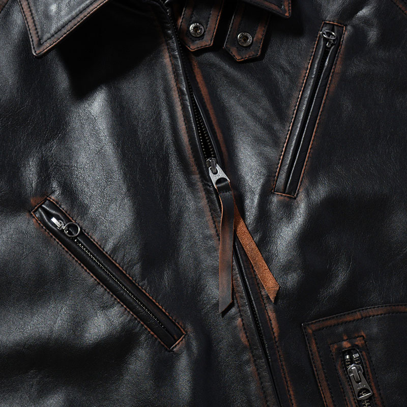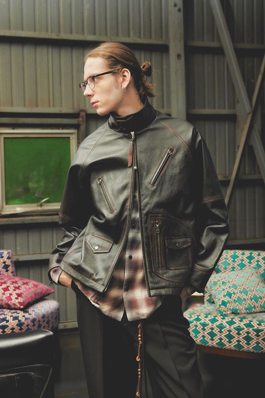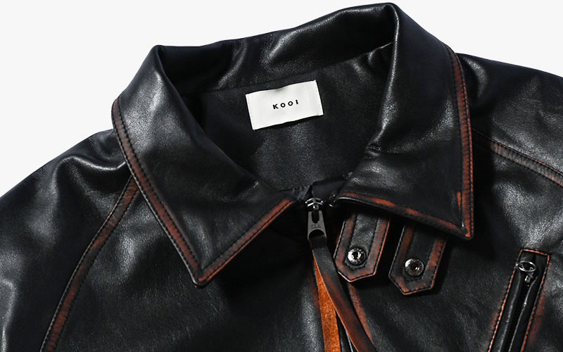 [25KO-AW19]茶芯のカウレザーを丁寧に削り出し、ヴィンテージレザーのような深みとエイジング感を表現したブルゾン。やや赤みを帯びたブラウンで染め上げることで、無骨さの中にも上品さを感じさせる一着。ラグランスリーブによるリラックス感のあるシルエットに、Dポケットやコインポケットなど、ヴィンテージライダースの象徴的なディテールを踏襲。ファスナーポケットのリング引き手など、細部までリアルな再現にこだわりました。襟元にはチンストラップを備え、防寒性とデザイン性を両立。ダブルファスナー仕様により、下側を開けてAラインを作るなど、スタイリングに動きを加えることも可能です。時を重ねるごとに自分だけの表情へと育つ、存在感あるレザーブルゾンです。※お手入れ前には必ず品質表示タグをご確認下さい。※商品実物と画面上では、多少色味が異なる場合がございます。-KOOI(コーイ)-好意、高位、更衣など様々なこういを意味する。人々が暮らしの中で着用する衣服。良質で品があり、思わず着替えたくなる様な服を提案し、人々に好まれるブランドを作っていく。2025 AUTUMN/WINTER COLLECTION "craftsmanship"実店舗でのお取り扱い●裏寺本店●三条店●堀江店●NU茶屋町+店●なんばパークス店●EXPO CITY店●西宮ガーデンズ店●名古屋PARCO店●渋谷店