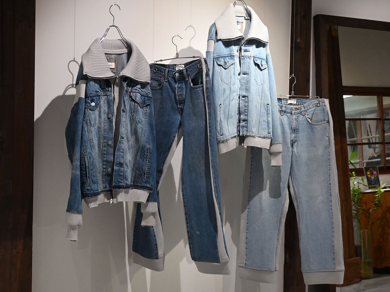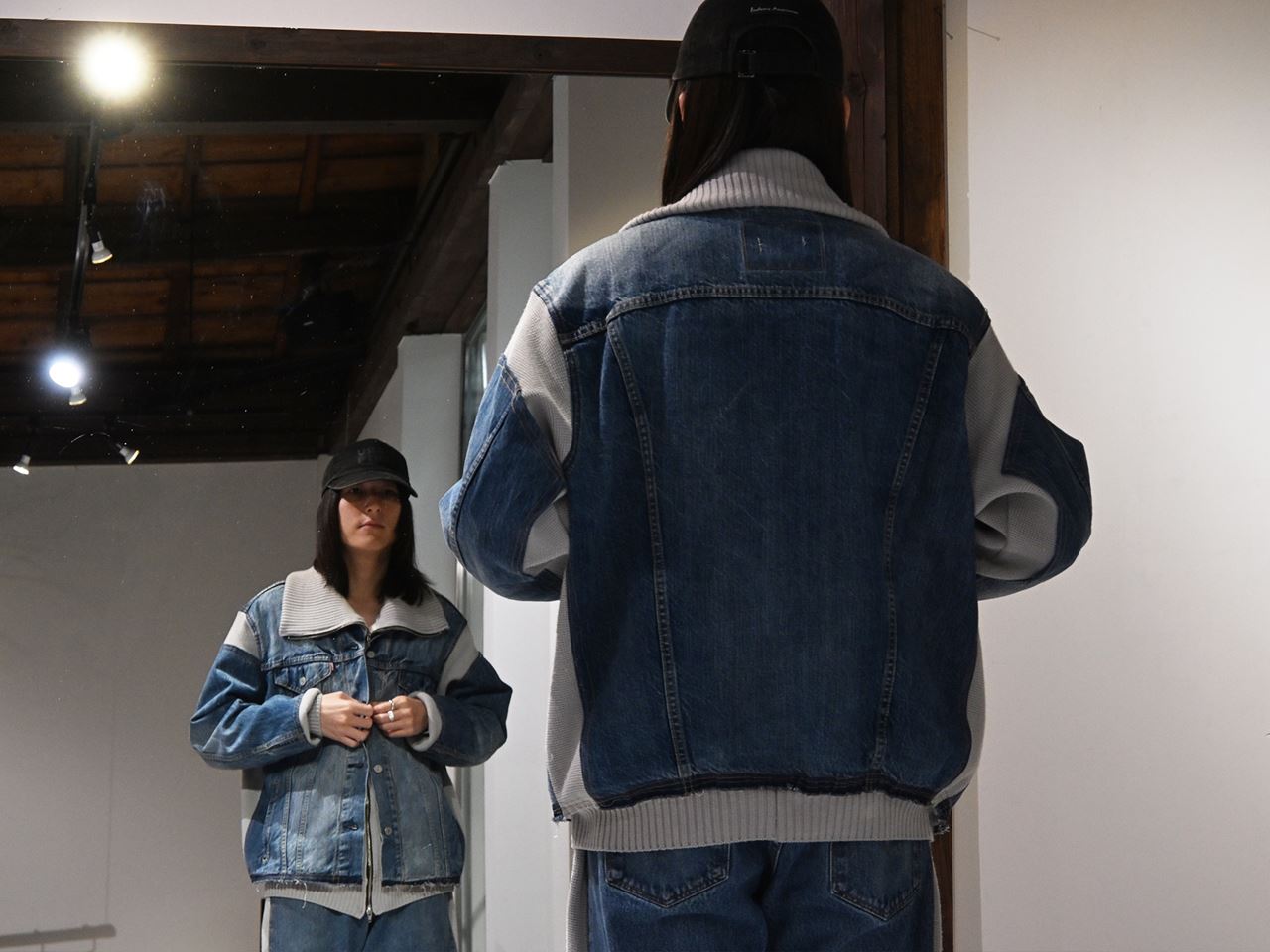 今回はこれまでの別注企画で展開してきたニットの要素に古着のデニム取り入れた、デニムジャケットとデニムパンツを製作。