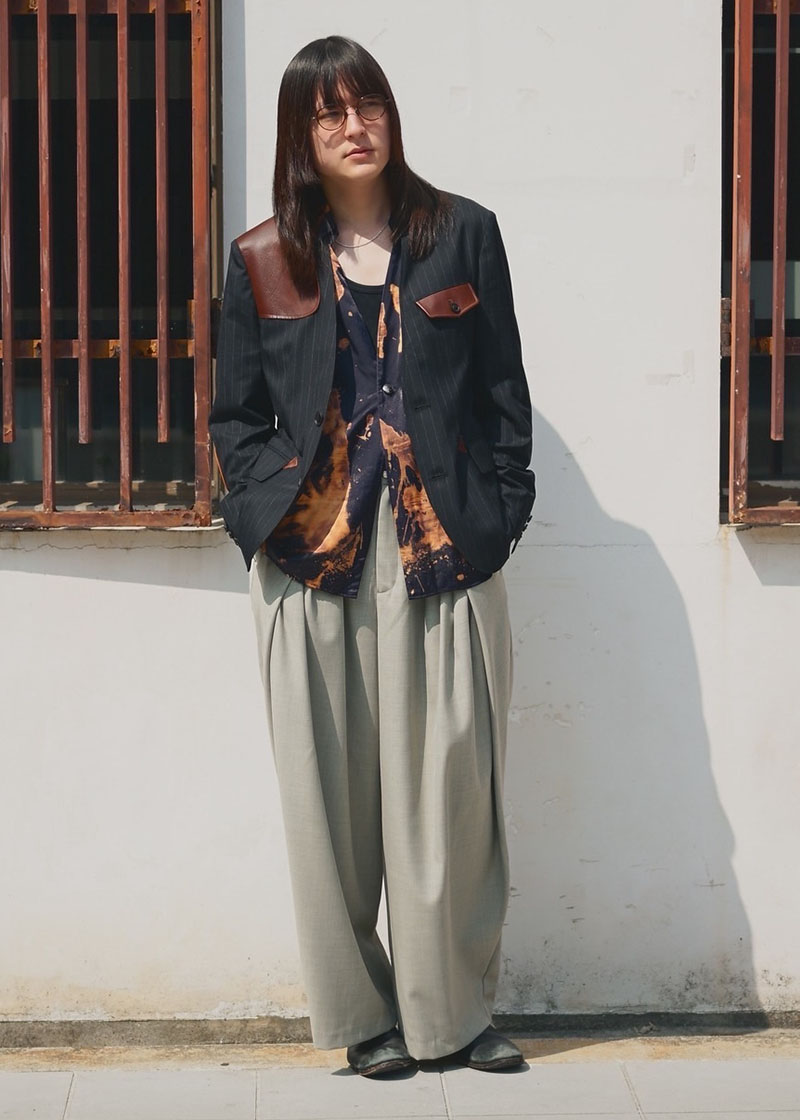 素材の落ち感と構築的なタック設計が生み出す、動きで完成する一本。