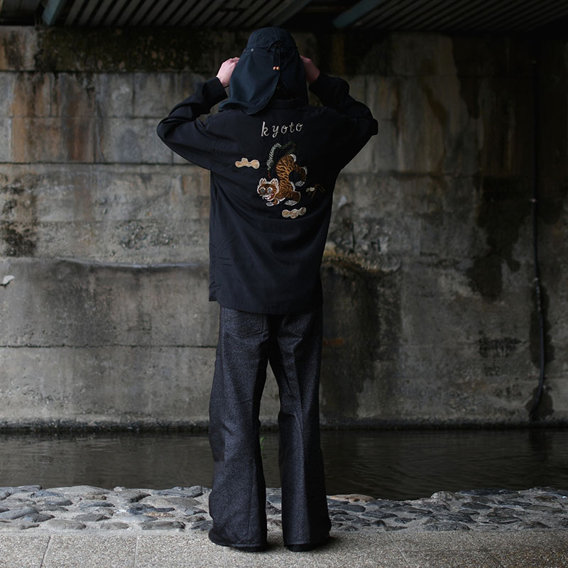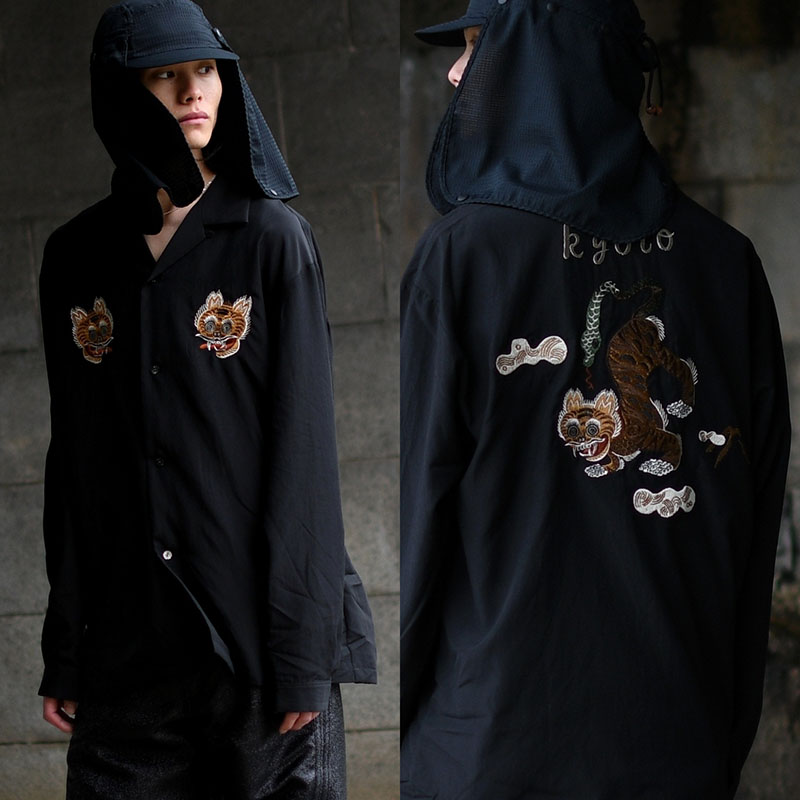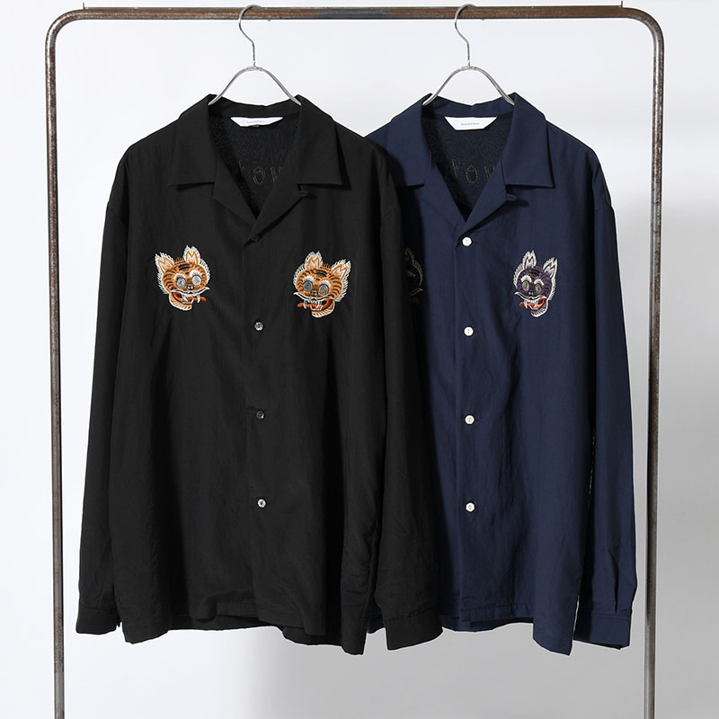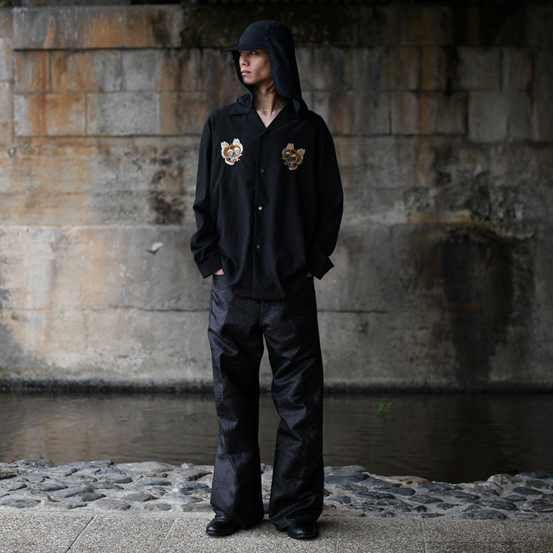 [2026-SY9-001]Sasquatchfabrix.に特別に製作して頂いた印別注アイテム。25SSシーズンにTシャツとして展開した"NUE"のオリジナルグラフィックを更にアップデートし、本作ではオープンカラーシャツとして再構築。フロント、バックに至るまで全て刺繍で表現されたグラフィックは圧倒的な存在感を放ちます。素材はコットン×レーヨンの微光沢の上品な生地を使用。レーヨンの滑らかなドレープ感と、コットンの自然で柔らかな風合いを併せ持った生地感となります。背面裏地にはポリエステルの楊柳生地を配置することで、刺繍裏の糸が肌に当たらずさらりとした着心地に。生地感、刺繍の雰囲気に合うよう装飾ボタンを使うなど、細部にまでこだわった仕上がりとなっています。鵺(ぬえ)は猿の顔、狸の胴、虎の足、蛇の尾をもった異形の妖怪。平安の世を騒がせた存在として語り継がれています。京都には弓の名手、源頼政が鵺を退治したという伝説が残されており、二条公園の鵺池碑や鵺大明神など今なおその痕跡が街の中に息づいています。印が本店を構える京都に関わりの深いモチーフとなっています。ただ怖いだけではない。歴史や文化、自然と重なりながら日本的な精神性を内包する妖怪という存在。その物語と美意識を纏う一着をぜひ体感してください。■サイズ感について腕周り、身頃はレギュラーフィットのすっきりとシルエットですが若干肩幅は広め。180cm/60kgのモデル着用で、少し肩が落ちたややゆとりのある見え方になります。およその目安M:160cm後半~170cm前半L:175cm前後XL:170cm後半~180cm前半ワンサイズ上げてライトジャケット感覚でゆったりと袖感をたるませるように着用するのもおすすめです。【スタイリング提案】・ワイドパンツと合わせたオリエンタルスタイル・ブラックスラックスと合わせた上品な着こなし・デニムと合わせたカジュアルミックスコーデ【商品特徴】・フロントからバックまで全面刺繍のデザイン・レーヨン×コットンの滑らかな素材感・程よい光沢とドレープ性・裏地付きで快適な着用感・オープンカラー仕様で抜け感のある印象・別注ならではの存在感のある仕上がり※サイズスペックには個体差があり若干の誤差が出る場合がありますので予めご了承下さい。※お手入れ前には必ず品質表示タグをご確認下さい。※商品実物と画面上では、多少色味が異なる場合がございます。-Sasquatchfabrix.(サスクワッチファブリックス)-ファッションとは時代の民度を強く反映させたものであり、そうあるべきものだと考えます。常に前衛的でなければならないものであります。私たちなりの「ファッション」を表現するために、その時代に対して、強度のあるテーマを設定し、クラシカルの肯定と否定を繰り返しながら前衛的で「遊び心」のある洋服づくりをしています。新しい時代のリアリティを追究し、固有の地域に住む者、この時代に生きた者にしか作れない民族性のある物作りも私たちにとって重要なテーマのひとつになっています。実店舗でのお取り扱い●裏寺本店●堀江店●渋谷店